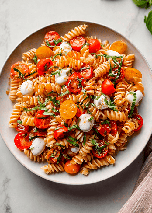 Томатная основа получается насыщенной и слегка сладковатой за счёт черри, а мини-моцарелла мягко подплавляется, обволакивая макароны нежной сливочной текстурой.